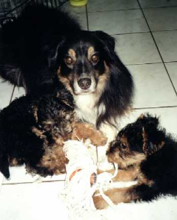 | Arrow (Australian Shepherd) - enjoys playing with WYSIWYG Welsh terrier puppies. If only he could keep them all together! |