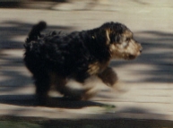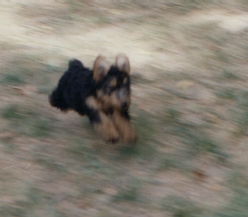 | Above: Yellow pup racing by. Below: Lleu playing with the pups! |