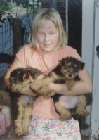 | FRI. Sept. 13 - the pups visit Linda's yard for the first time and play with Lark, their ten-month-old sister and Hogyn, their eighteen-month-old brother. Lark and pups shown in these surrounding pictures. |