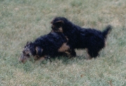 | becoming individuals by practicing a nap in separate crates (in several different rooms in the house), and spending time in separate exercise pens. TUES. Sept. 3 - Spent their first overnight in individual crates. Woke up and vocalized several times during the night. After allowing a few minutes for a potty break, the pups were returned to the crate and they settled again. Usually, they are outside first thing in the morning, then inside for breakfast and then outside again for another potty break. They spend daytime in separate exercise pens with a small crate bed and newspapers for a potty area. They spend evenings playing in the yard and house, have a second meal while doing a bit of training - sit, down, stand (puppy push-ups) and domination exercises. |